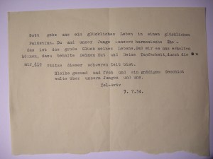 Letter from Fritz to Frieda on her first birthday in Tel Aviv, 1934. “God gave us a lucky life in lucky Palestine. You and our child –– our harmonious marriage –– this is the great happiness/luck of my life. That we can hold on, in addition to keep your courage and your bravery, through which you have backup this hard time. Be well and pleased and a gracious luck/fate may be on our son and on us. Tel-Aviv, 7.7.34”