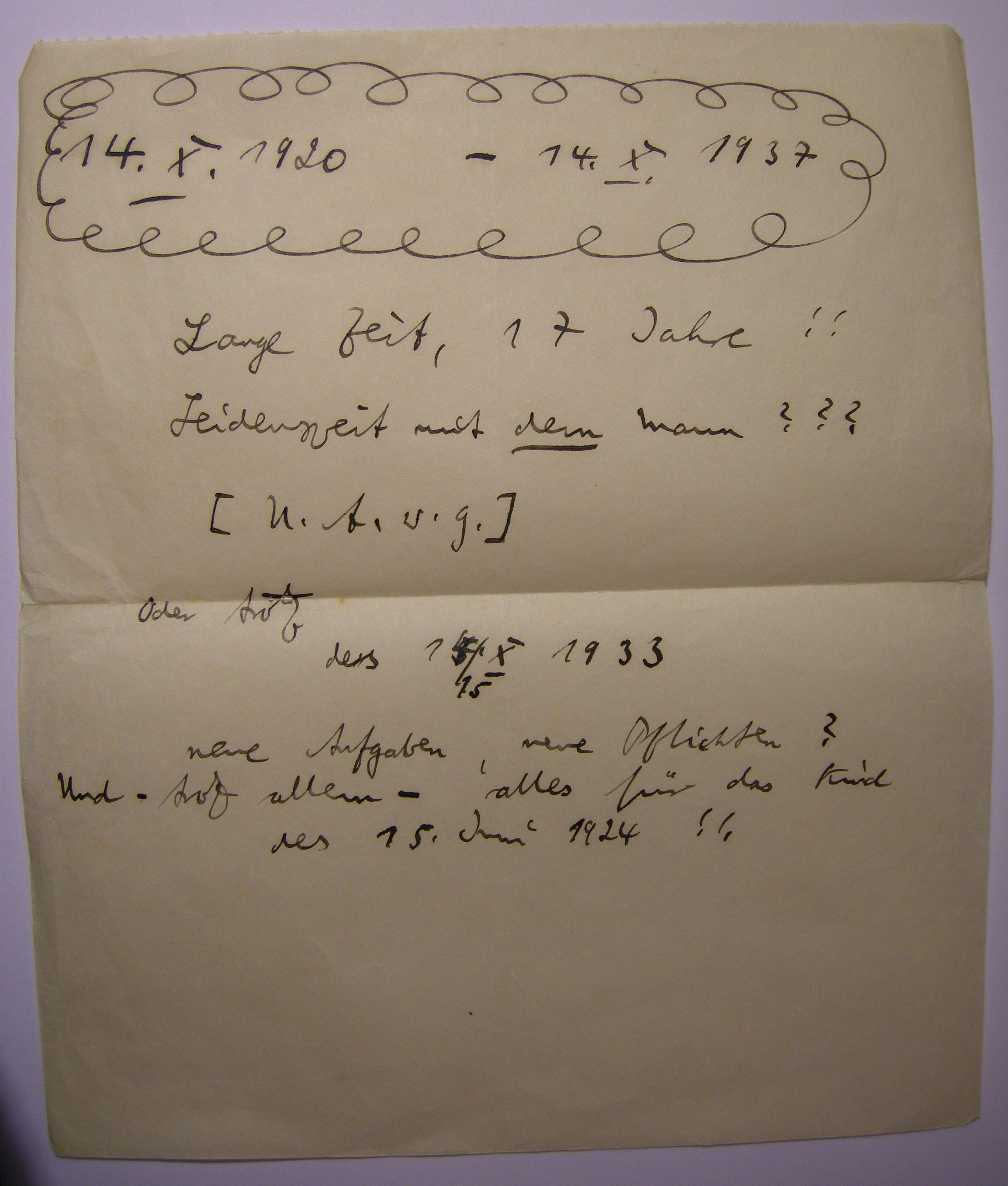 Letter from Fritz to Frieda for their 17th wedding anniversary, Tel-Aviv, 1937. “Long time, 17 years!! […] or on the 15.10.1933 new challenge, new responsibilities? And –– above all –– everything for the child, of 15 June 1924!!”