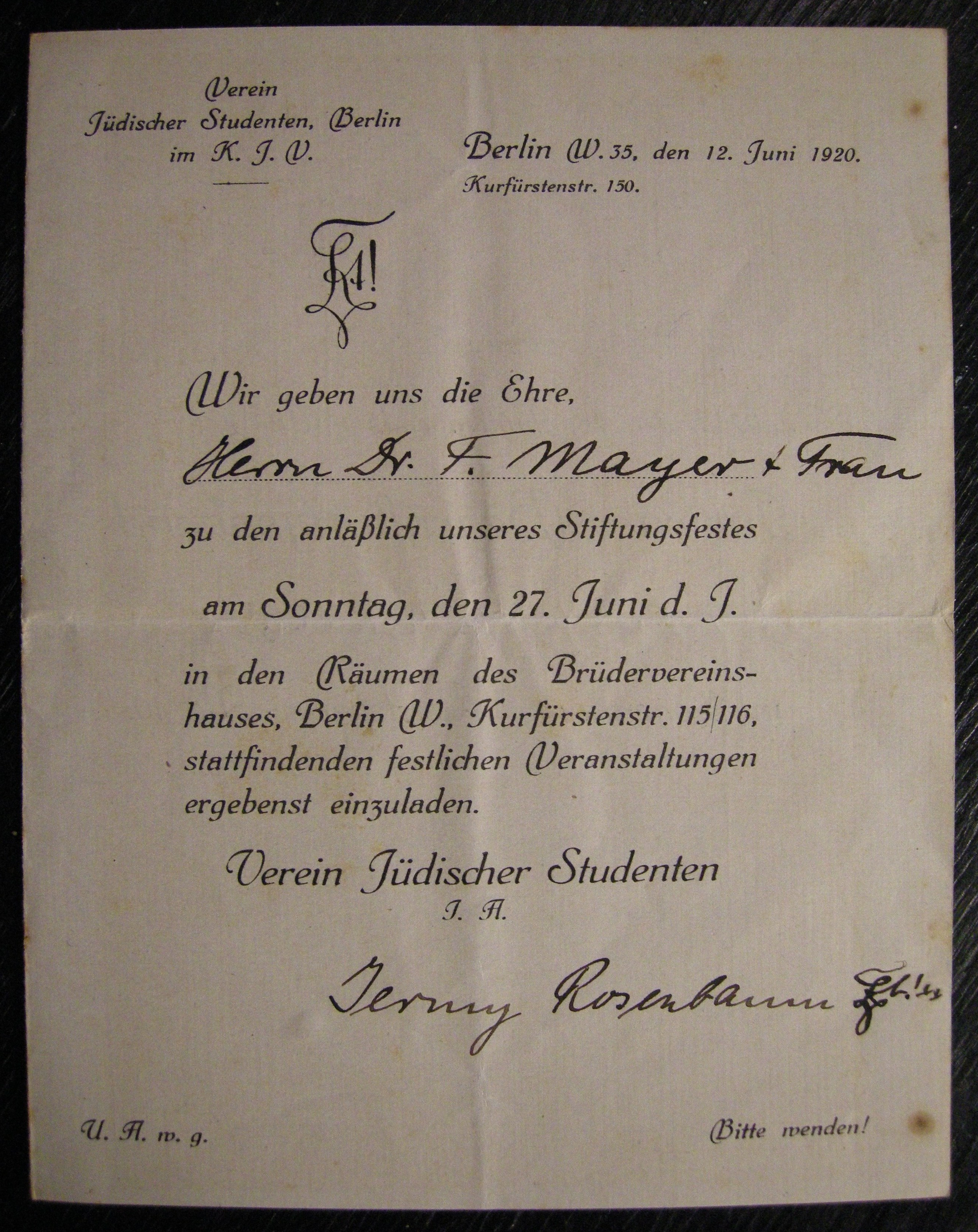 Invitation for “Mr. Dr. F. Mayer & Mrs” for evening of foundation celebration, Association of Jewish Students, 27.6.1920. Zionist Jewish Students association, which Fritz joined probably while studying medicine in Heidelberg. https://de.wikipedia.org/wiki/Kartell_J%C3%BCdischer_Verbindungen#cite_ref-11