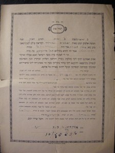Ktuba – Jewish marriage document of Frieda and Fritz marriage, Berlin, Bet Cheshban, 14.10.1920. The names in the Ktuba are Fritz’s Hebrew name “Israel” and “Friderike”.